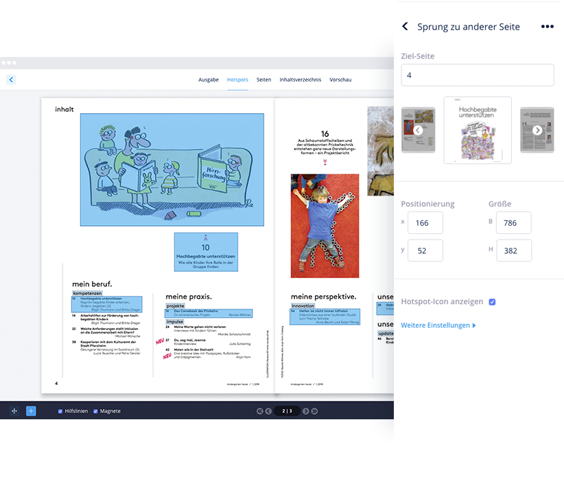 Die Bedienoberfläche ist übersichtlich gestaltet: Eine Seitenleiste zeigt alle Hotspots der aktuellen Seite auf einen Blick. Beim Platzieren eines Hotspots können Sie die Metadaten direkt in der Seitenleiste bearbeiten, während der aktive Hotspot farblich hervorgehoben wird. Position und Größe lassen sich entweder über präzise X- und Y-Koordinaten einstellen oder flexibel per Maus anpassen. Magnetlinien erleichtern das exakte Ausrichten von Hotspots, sodass Flächen automatisch auf gleiche Höhe oder Länge gebracht werden können – für ein sauberes, professionelles Layout.